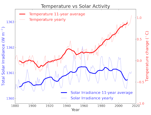 • Morano mentions "the sun" as "one of the key drivers that Al Gore tries to diminish". Actually, solar radiation has varied by less than 0.2% in the last couple of centuries, and its variation does not correlate with the Earth's temperature.